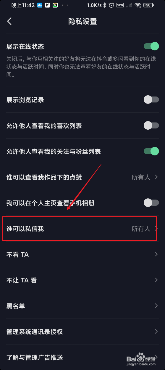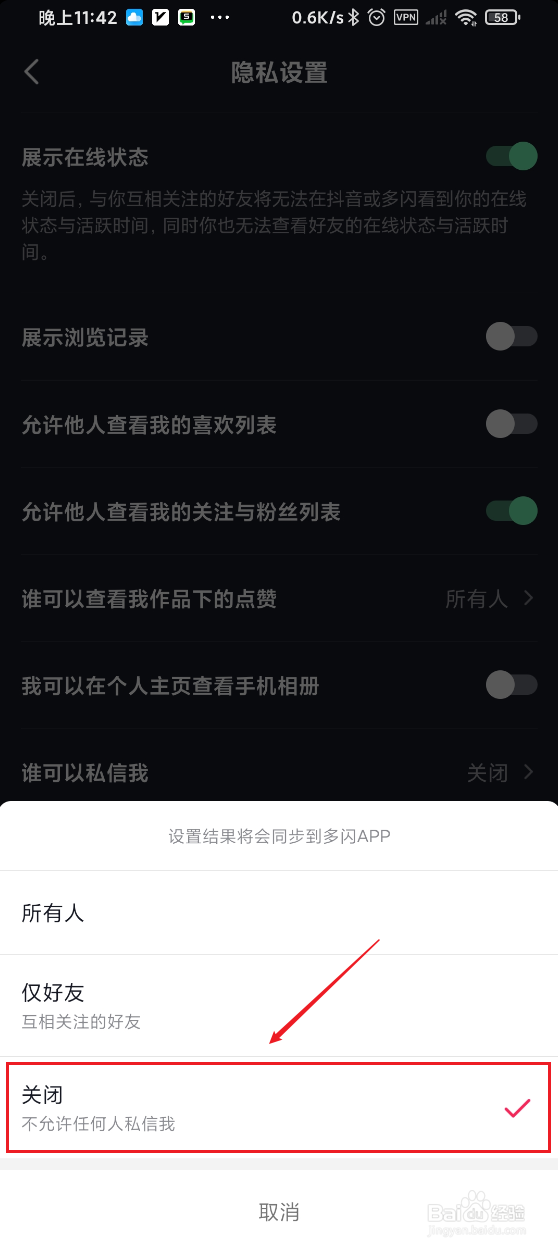 6、在弹出的列表中点击“关闭”即可禁止所有人的私信了